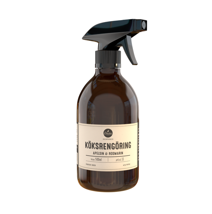 Köksrengöring är svensktillverkad, miljövänlig och biologiskt nedbrytbar produkt med doft av apelsin och rosmarin. Produkten kan användas på alla slags vattentåliga ytor som exempelvis bänkar, bord och kakel. Den är speciellt anpassad för att ta bort fett och grövre smuts i kök.